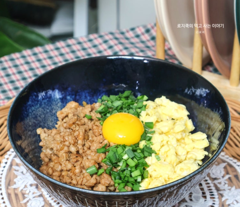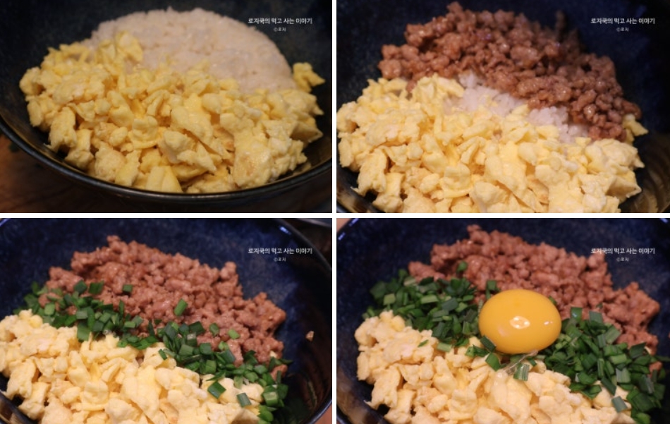 7. 밥을 그릇에 계란 스크램블, 돼지고기 소보로, 부추를 올린 후 가운데에 계란 노른자를 올려 마무리 해줍니다.