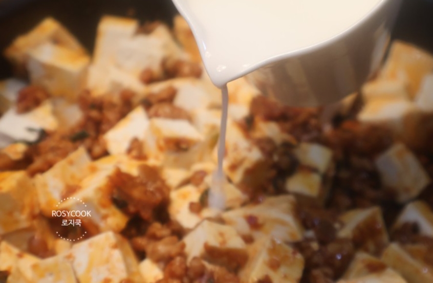 11. 마파두부에 준비해둔 전분물을 넣고 골고루 섞어줍니다. 한 번에 붓지 마시고 조금씩 나눠서 부어주셔야 뭉치지 않습니다.