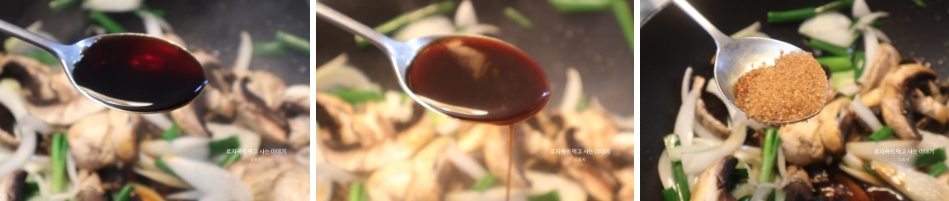 4. 설탕을 넣고 볶아줍니다. 미림과 진간장, 굴소스를 넣어줍니다.