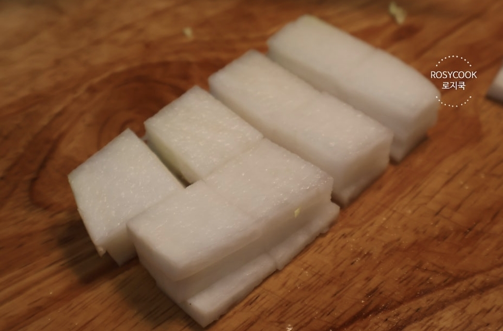 9. 알배추(소) 13장을 먹기 좋게 썰어주고 무 245g을 나박썰기 해줍니다.