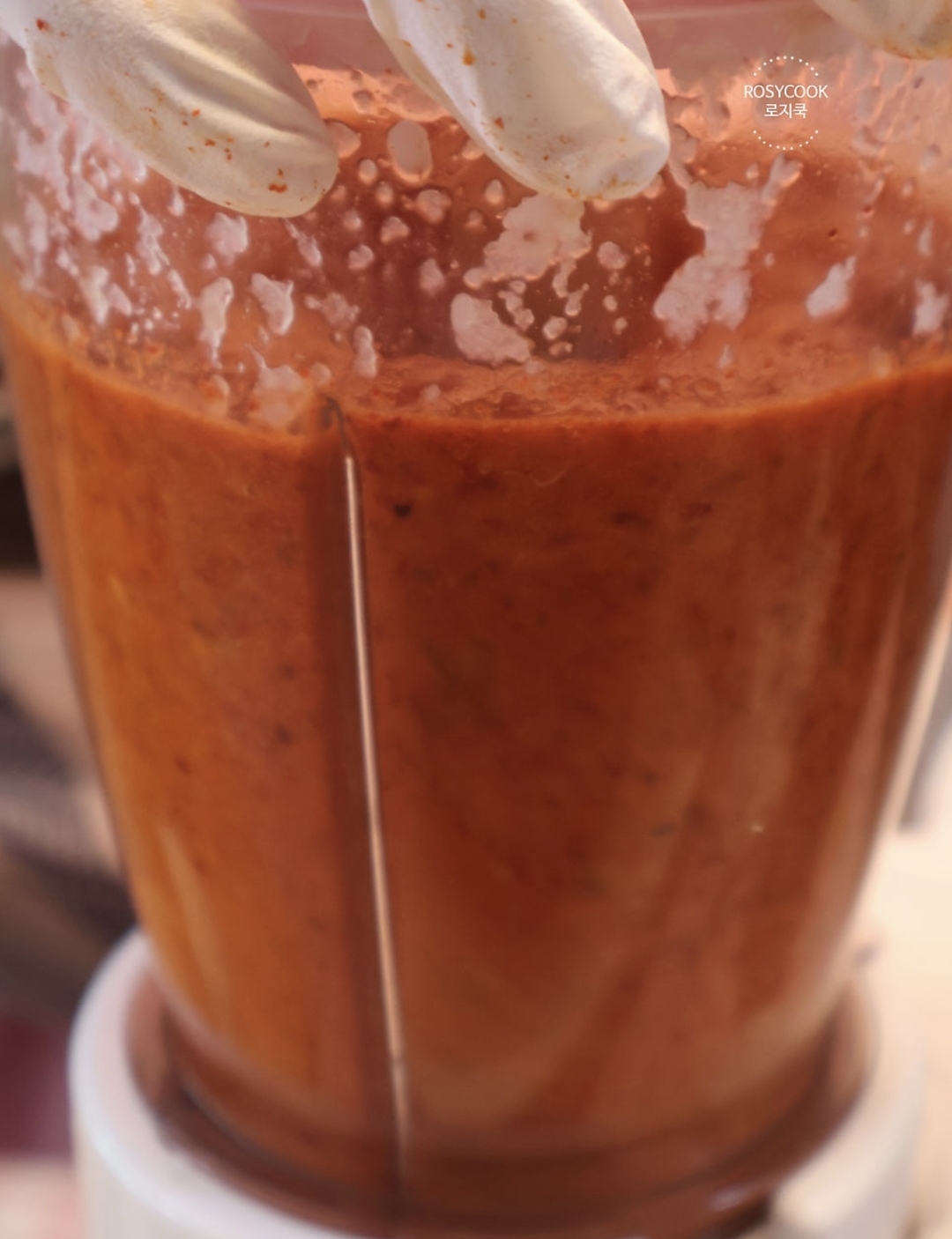 7. 고춧가루 5 큰 술을 넣고, 물 1900ml 중 일부를 붓고 다시 곱게 갈아줍니다.