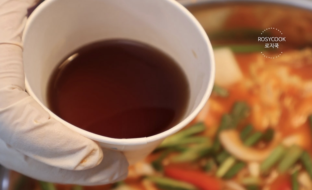 8. 양념을 체에 걸러서 준비해 주세요. 물 1900ml 중 남은 물을 믹서에 부어, 남은 양념을 정리해 가며 체에 부어 걸러줍니다.