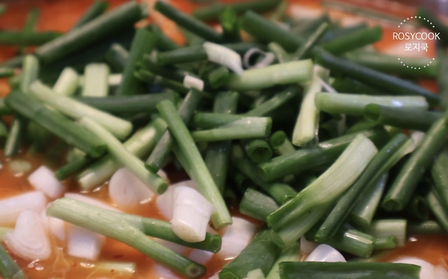 10. 쪽파 10대를 3cm 정도의 크기로 썰어주시고, 양파 1/2개를 채 썰어줍니다.