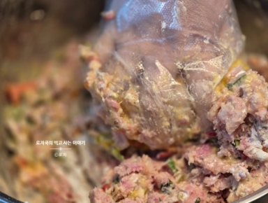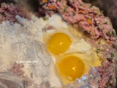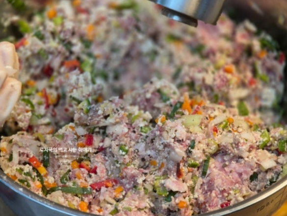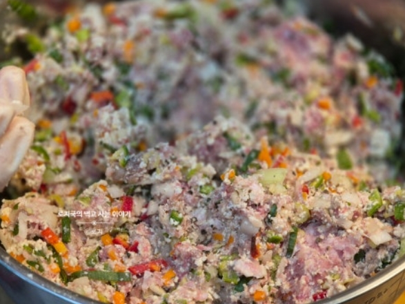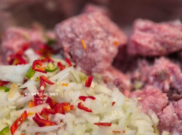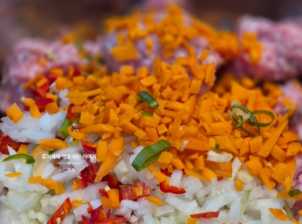 3. 돼지고기 다짐육 551g과 소고기 483g을 넣어주고, 다져둔 양파, 청양고추, 홍고추, 당근, 파를 넣어줍니다.