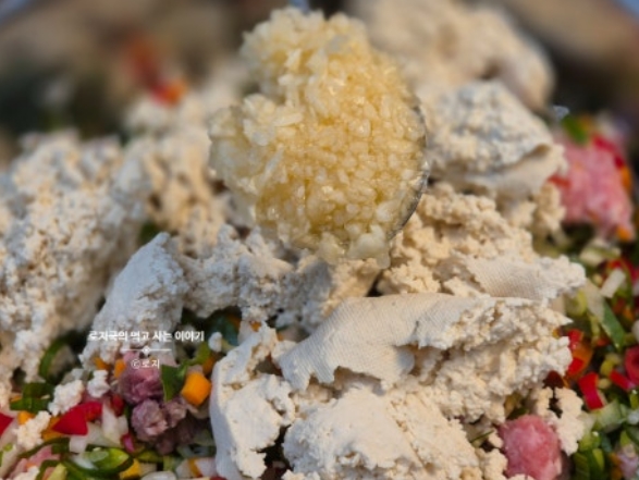 5. 수분을 짠 두부를 넣고 간 마늘 1 큰 술을 넣어주고, 잘 버무려줍니다.