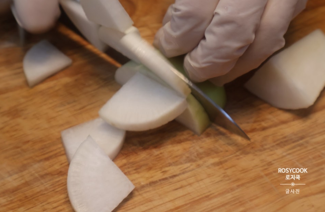 10. 물 1100ml를 부어주고, 무와 호박을 넣어줍니다.