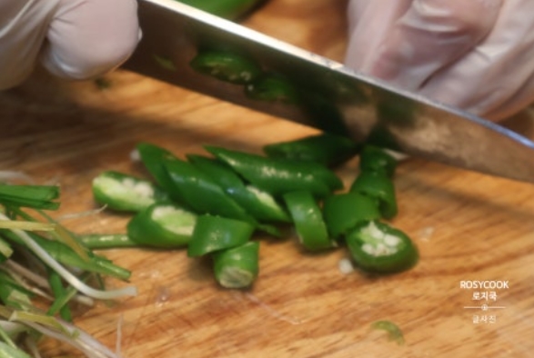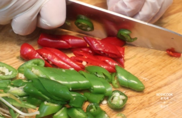 4. 청양고추 3개와 홍고추 2개를 송송 썰어줍니다.
