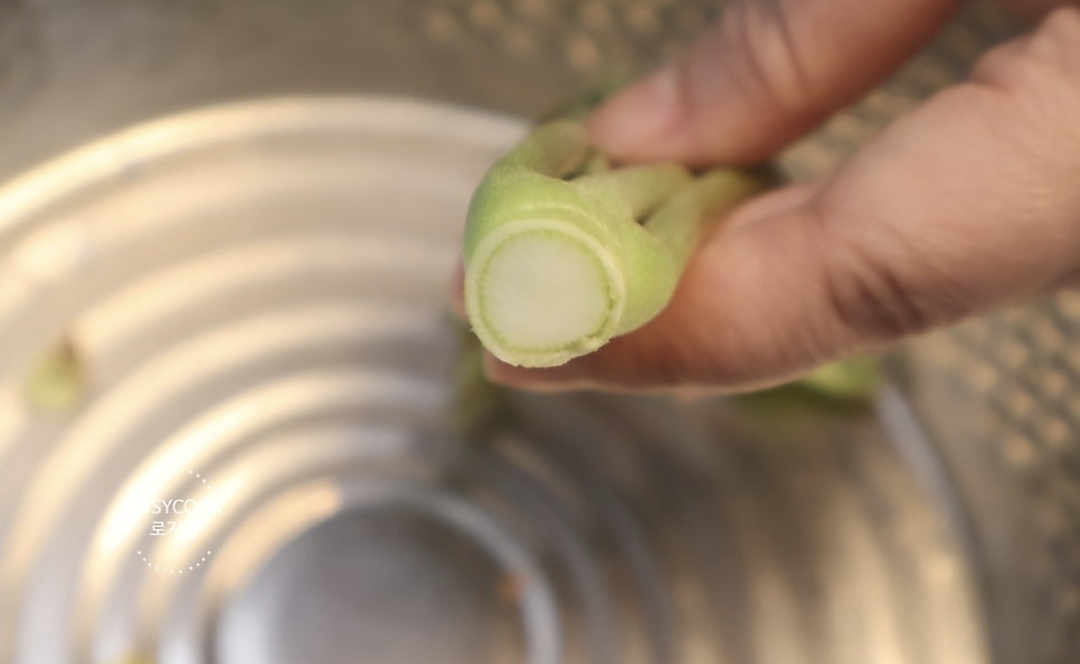 5. 잎 부분을 잡고 줄기 부분을 먼저 담그면서 넣어줍니다.