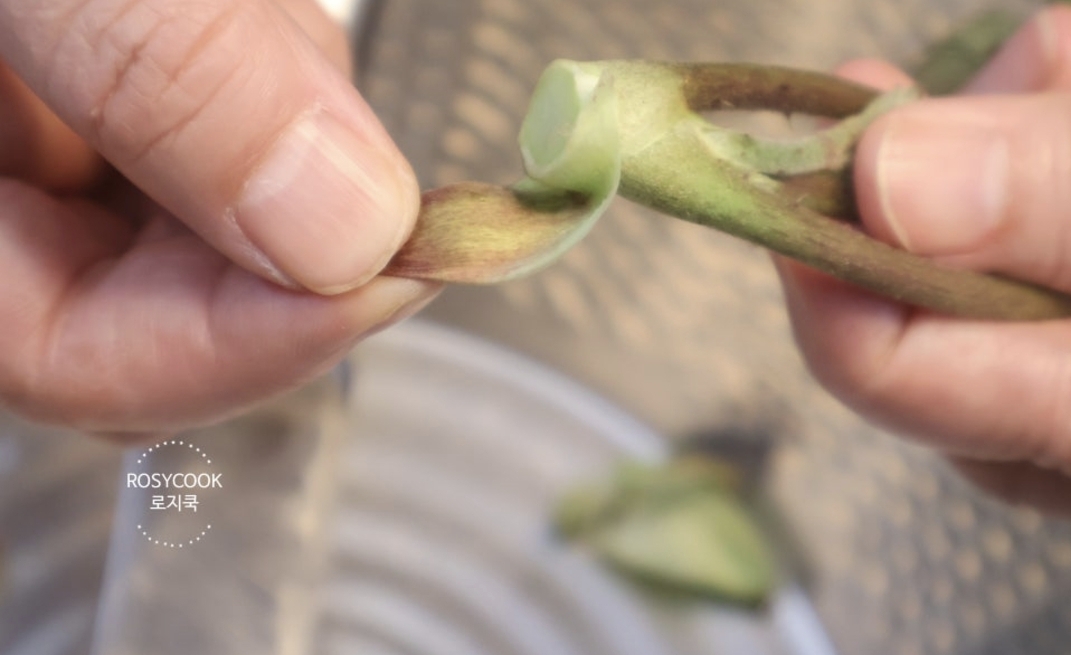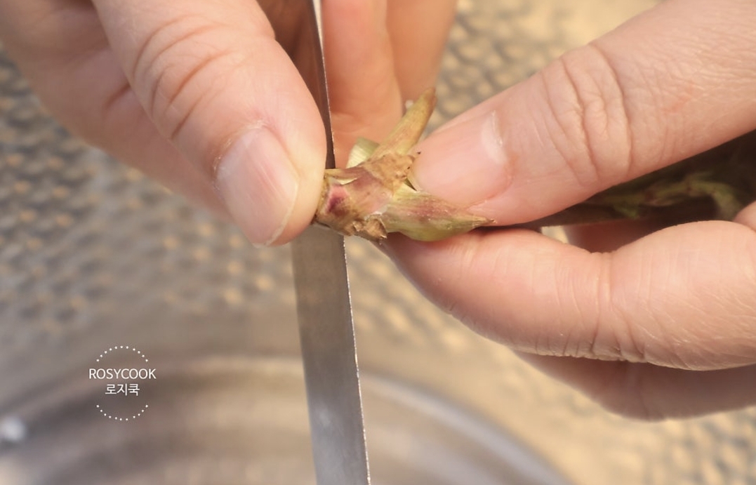 2. 껍질이 있다면 벗겨줍니다. 제가 사용한 참두릅은 아주 연해서 가시가 없었는데 줄기 부분에 가시가 있다면 칼로 살짝 긁어내시면 됩니다.