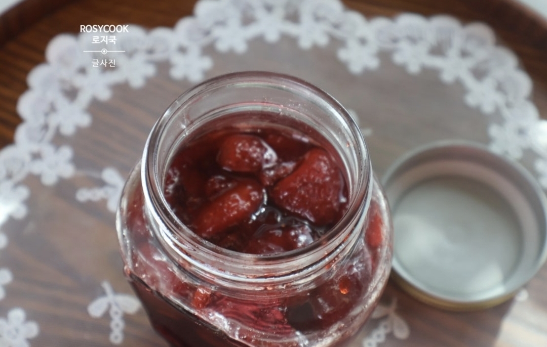 병을 완전히 말린 후, 딸기잼을 식혀서 담아주고, 냉장 보관해 줍니다. 수제 과일잼이기 때문에 빨리 드시는 게 좋긴 합니다. 1달 안으로는 다 드시는 게 좋습니다.