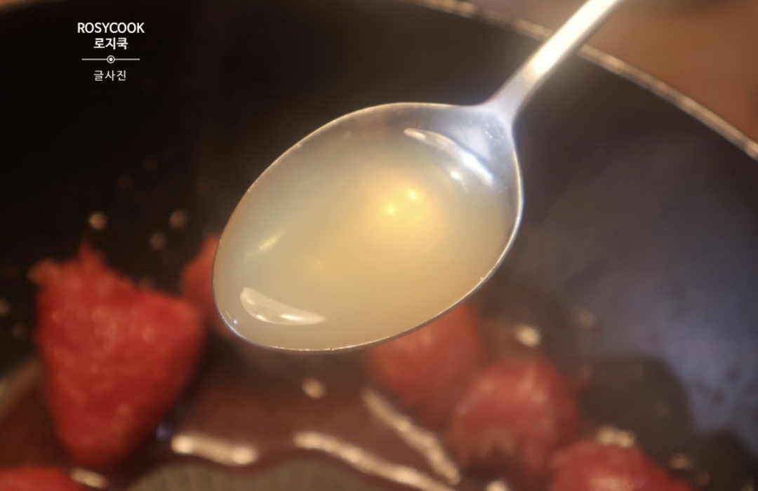3. 딸기에 설탕이 골고루 묻었다면 불을 켜주시고 끓여줍니다. 레몬즙 2 큰 술을 넣어줍니다.