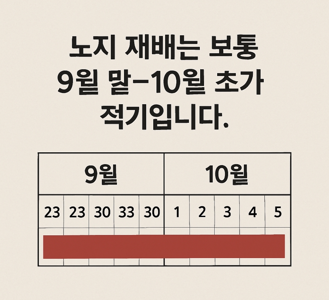 • 노지 재배는 보통 9월 말~10월 초가 적기입니다.