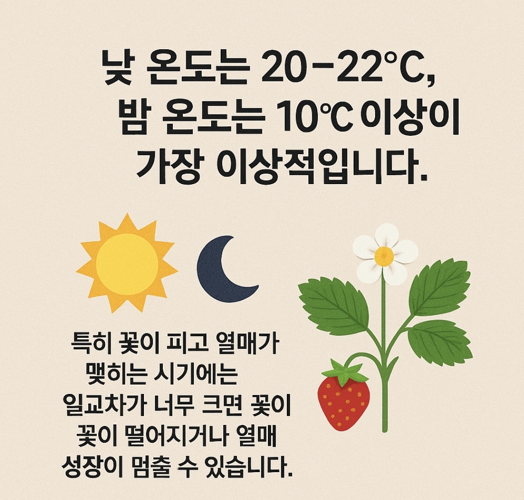 - 특히 꽃이 피고 열매가 맺히는 시기에는 일교차가 너무 크면 꽃이 떨어지거나 열매 성장이 멈출 수 있습니다.