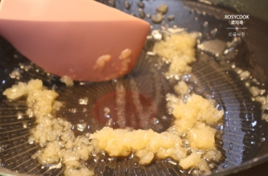 1. 간 마늘 1 큰 술을 넣고, 식용유 2 큰 술을 넣고 볶아줍니다.
