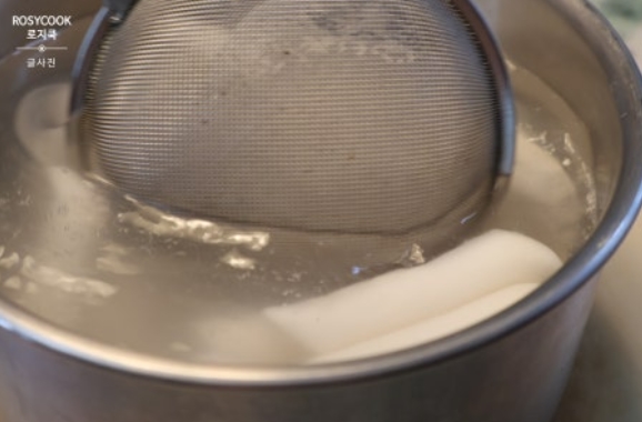 1. 떡볶이 떡을 끓는 물에 1분 정도 데친 후, 찬물에 잠시 담가줍니다. 체에 밭쳐 물기를 완전히 빼줍니다.