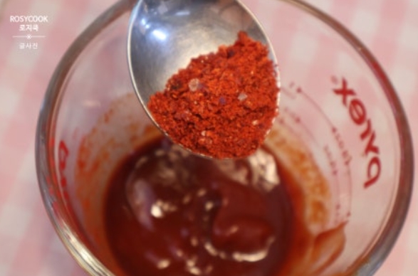 5. 케첩 2 큰 술, 고춧가루 1/2 큰 술을 넣어줍니다.