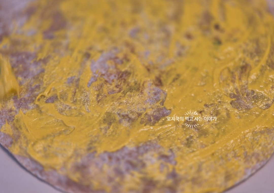 8. 구워둔 또띠아에 머스터드 소스를 펴 발라줍니다.