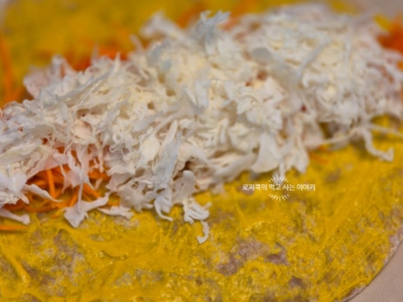 불고기와 양배추, 당근의 아삭한 식감이 아주 좋은데요. 양배추와 당근의 아삭한 식감이 불고기가 적절하게 어우러집니다. 그럼 불고기의 풍미와 아삭하게 씹히는 양배추 당근의 조합이 좋은 또띠아롤 샌드위치 또띠아 샌드위치 만들기 시작해 보겠습니다.