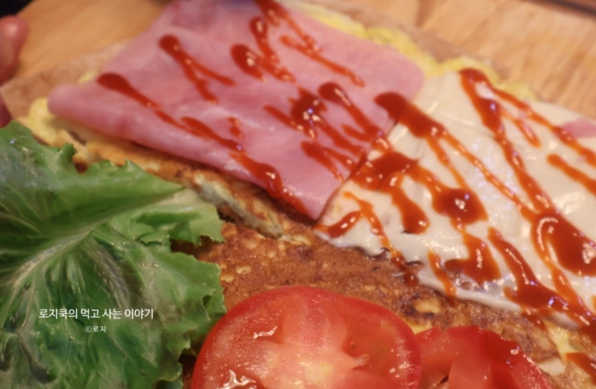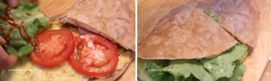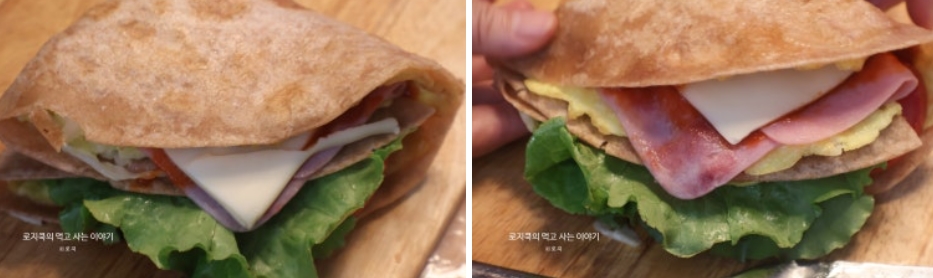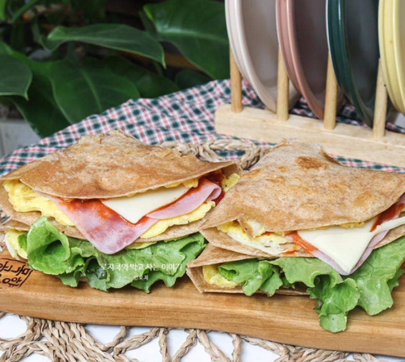 접어서 만드는 또띠아 샌드위치 입니다. 한 손으로 들고 먹을 수 있는 샌드위치로 귀찮을 때 이렇게 샌드위치 만들어서 드셔보시는 거 추천합니다. 계란과 양배추가 들어가서 든든하면서도 식감이 좋습니다.