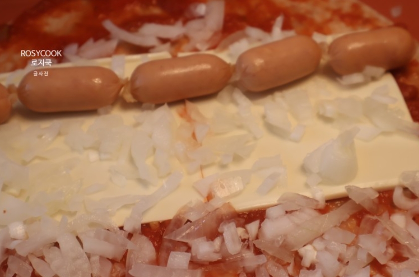 4. 비엔나소세지를 가운데에 길게 올려줍니다.