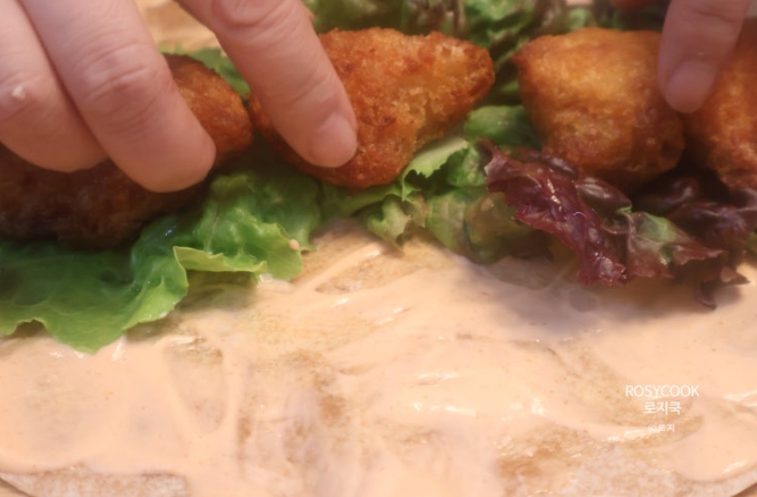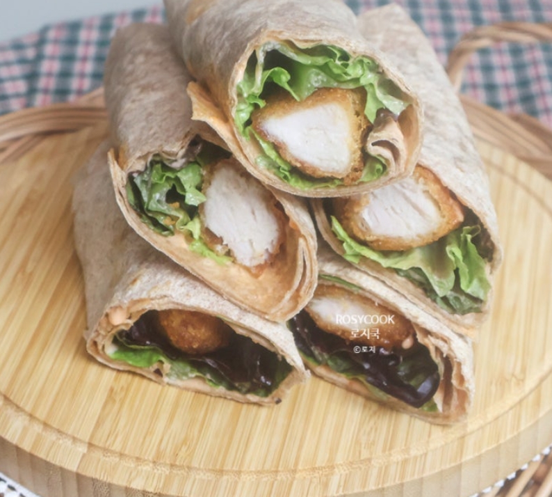 또띠아 활용 요리 하면 가장 먼저 떠오르는 것이 치킨랩이죠. 시판 냉동 치킨이 있으면, 간단하게 집에서도 만들어서 드실 수 있습니다.
