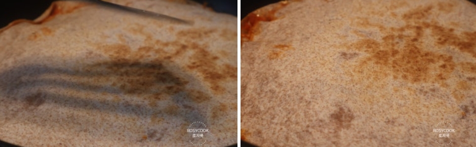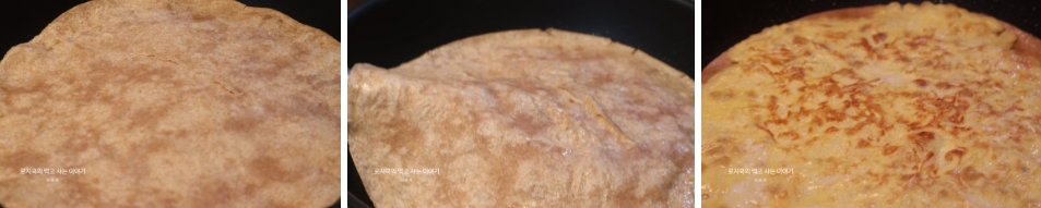 2. 또띠아의 겉이 노릇해질 때까지 마른 팬에서 구워줍니다.