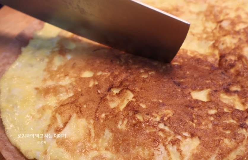 8. 계란과 함께 익힌 또띠아의 중앙까지만 칼집을 내줍니다.