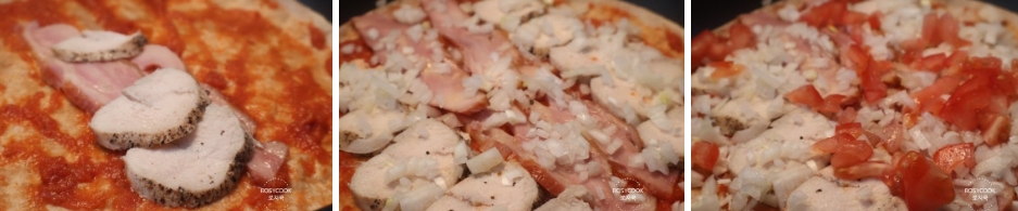 5, 그 위에 훈제 닭가슴살을 올리고, 양파, 토마토를 올립니다.