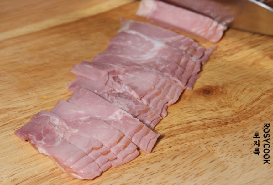 먼저 베이컨을 먹기 좋은 크기로 잘라주세요.