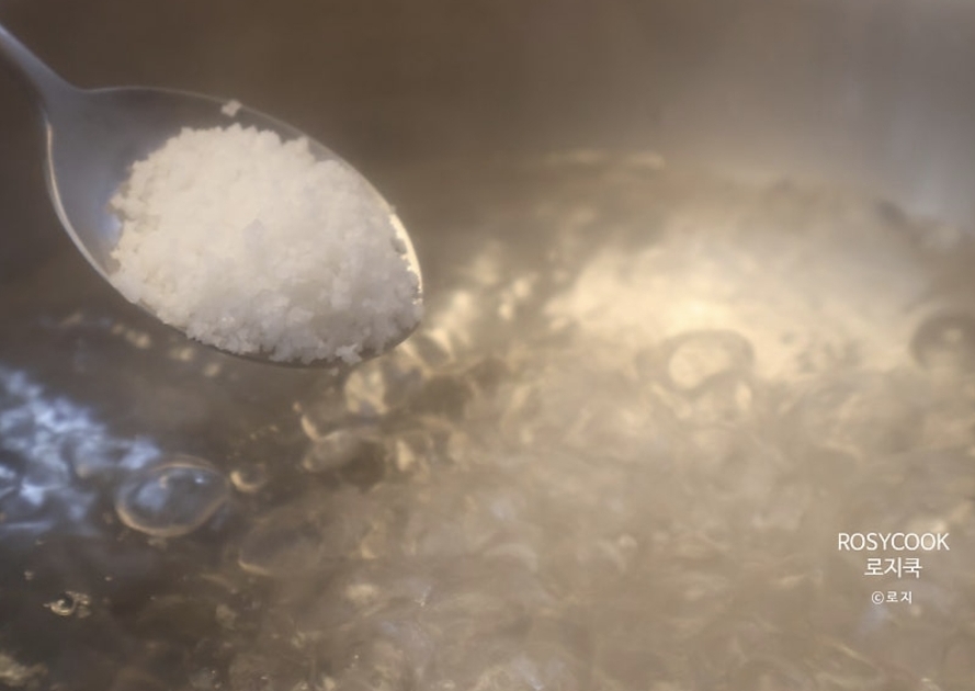 끓는 물에 소금 1/2큰술을 넣고 손질한 마늘쫑을 넣어줍니다. 1분만 데쳐주세요. 너무 오래 데치면 아삭한 식감이 사라지니 주의!