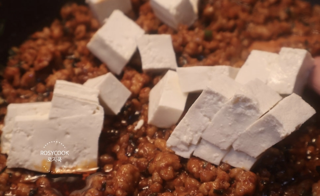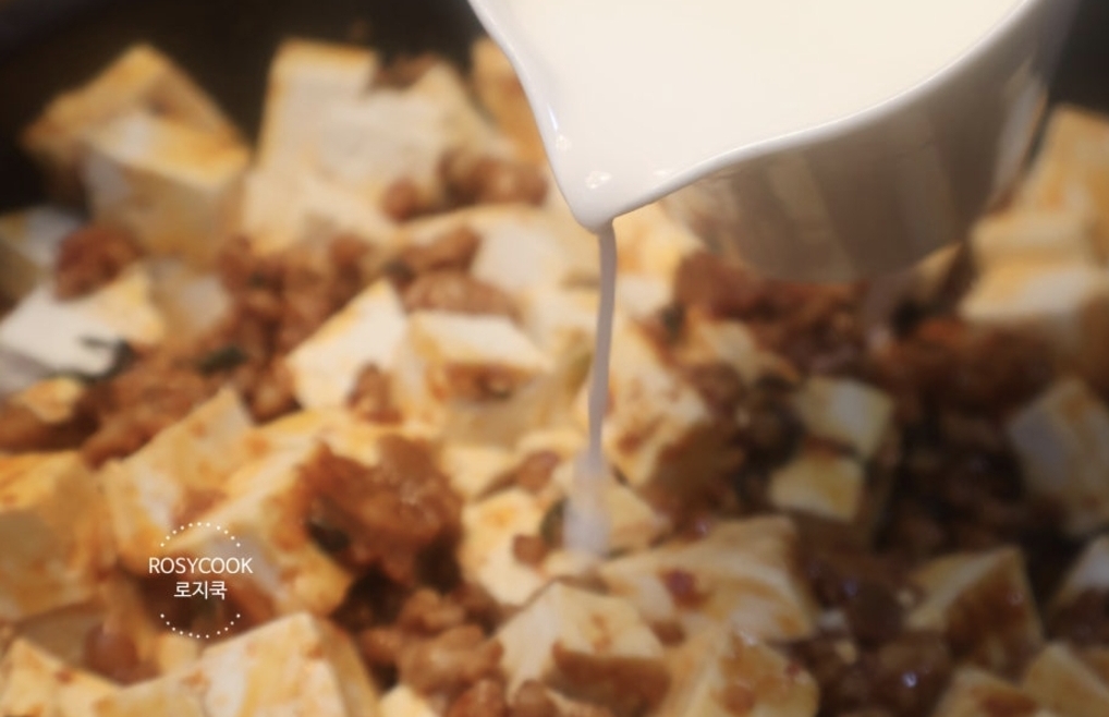 11. 마파두부에 준비해둔 전분물을 넣고 골고루 섞어줍니다. 한 번에 붓지 마시고 조금씩 나눠서 부어주셔야 뭉치지 않습니다.