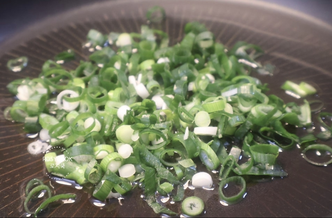 11. 참기름을 두른 후, 쪽파를 뿌려 완성해 줍니다.