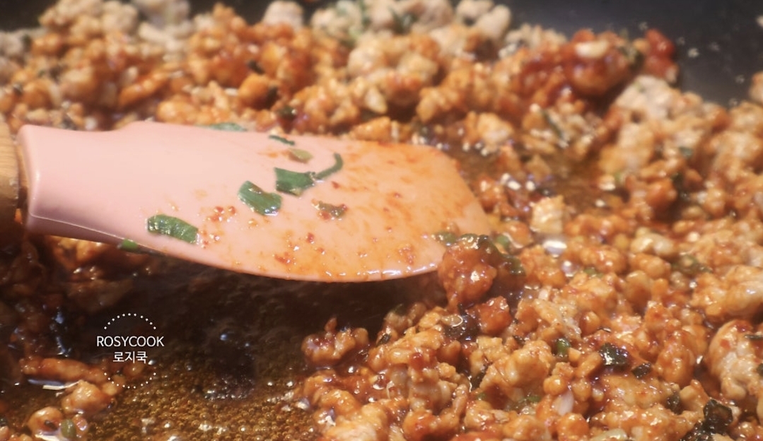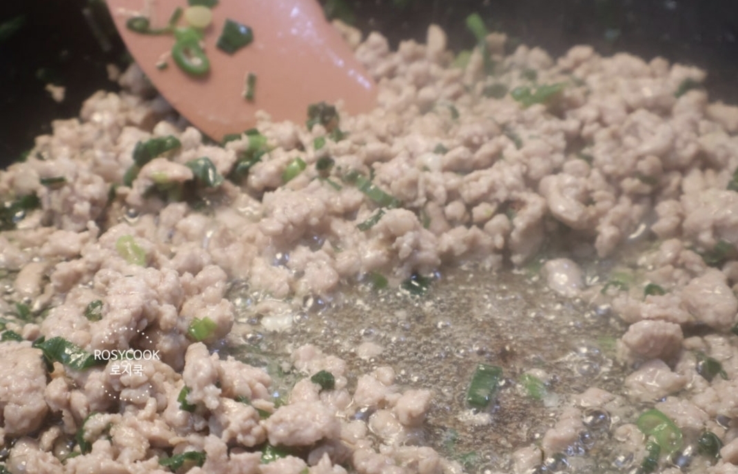 6. 파가 익기 시작하면, 돼지고기를 넣고 풀어가면서 볶아줍니다.