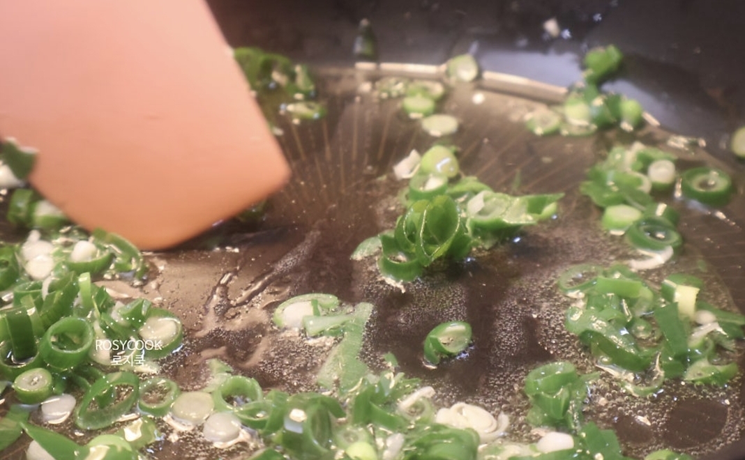 5. 중불에서 파를 볶아줍니다.