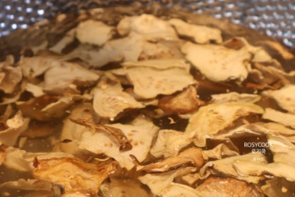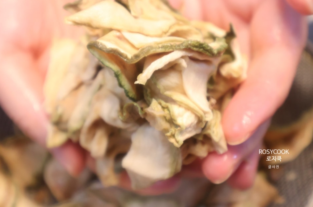 1. 호박고지 87g을 미지근한 물에 30분 정도 불려둡니다. 부들부들해질 때까지 불려줍니다.