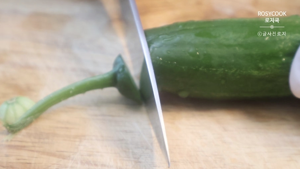 오이 한 개는 양 끝을 잘라낸 후 깨끗이 씻어 채 썰어주세요. 채를 얇게 썰수록 식감이 더 아삭아삭 살아나요.