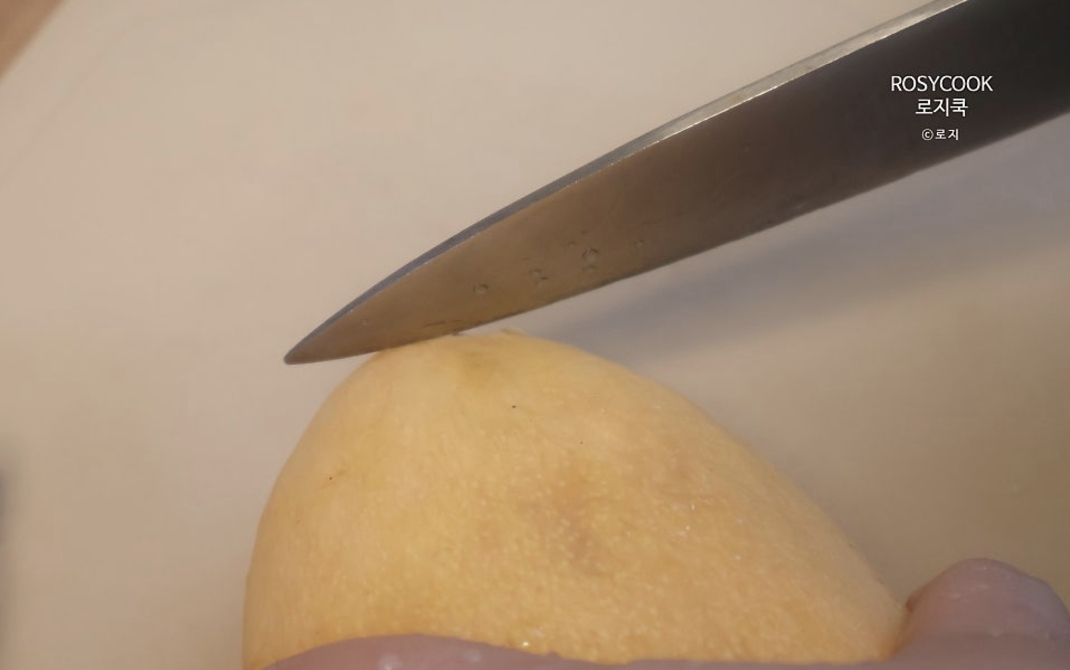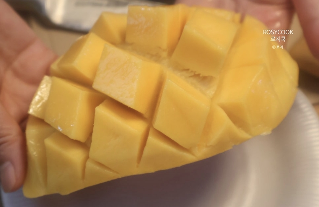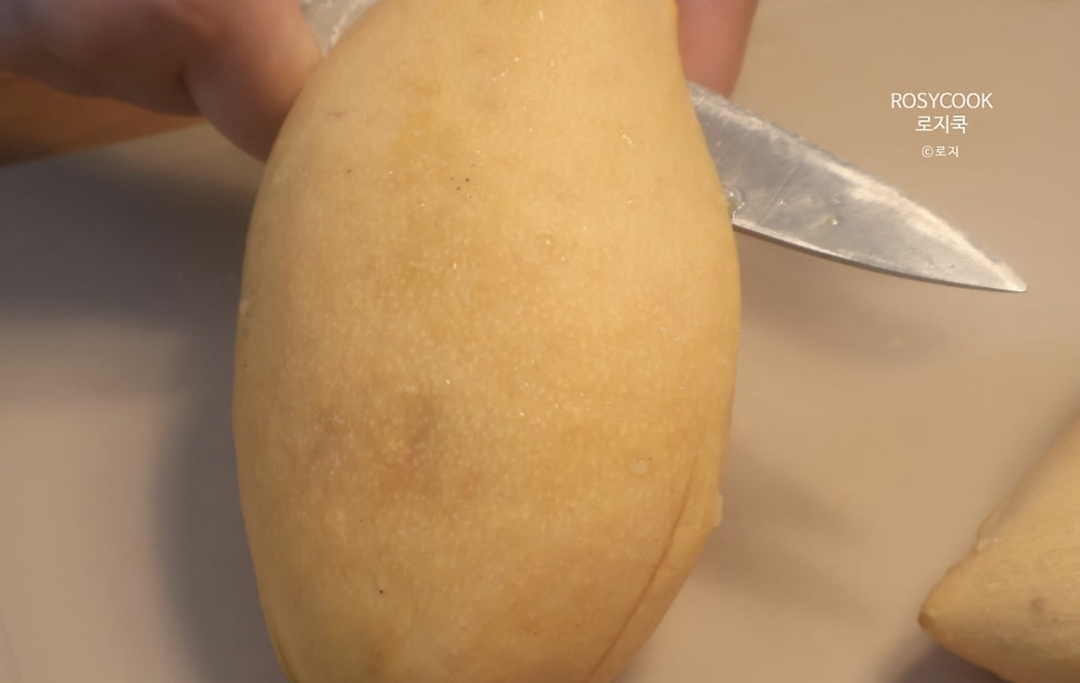 망고는 후숙해서 먹는 과일로 바나나처럼 검은점이 생길 때까지 익혀 먹어야 맛있죠. 처음엔 단단하지만 잘 후숙하면 자르는법도 어럽지 않습니다.