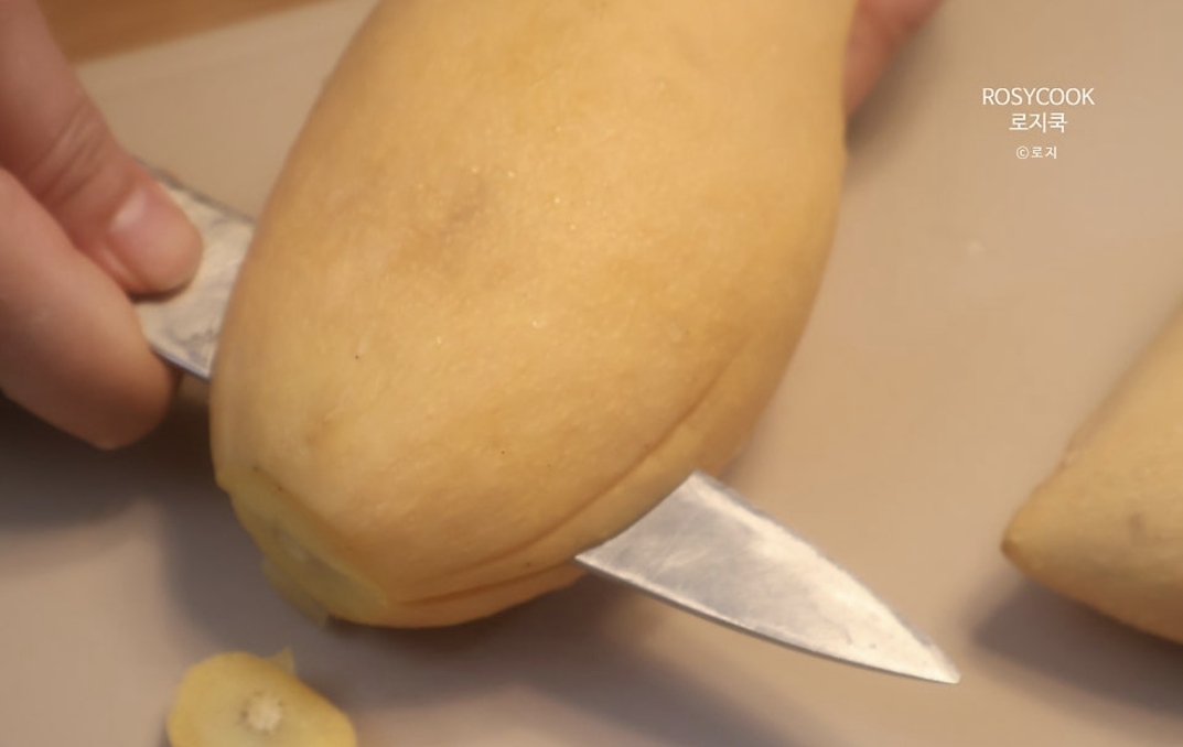 6. 꼭지 부분을 중심으로 씨앗이 있습니다. 3등분으로 길게 썰어줍니다. 중앙의 씨앗 부분을 피해서 썰어주시면 됩니다.