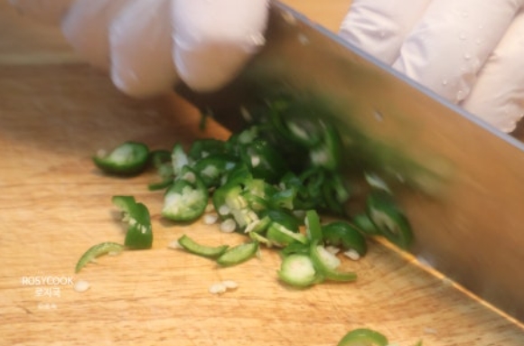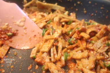 8. 팬에 남겨둔 어묵 반에 청양고추를 잘게 썰어서 넣어줍니다.