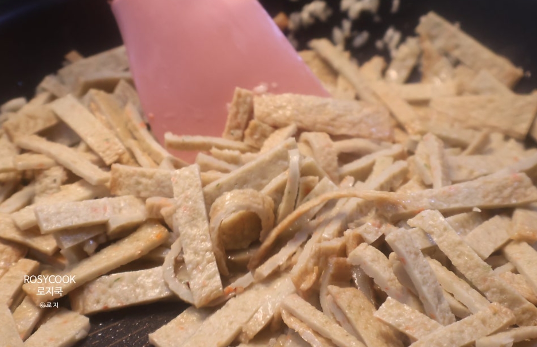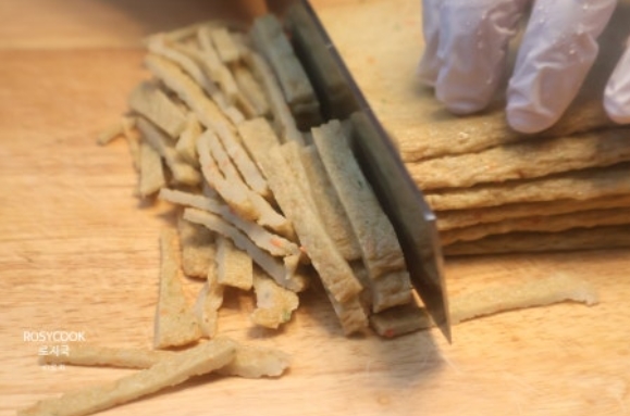 1. 사각어묵 8장을 얇게 채 썰어줍니다.