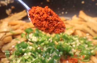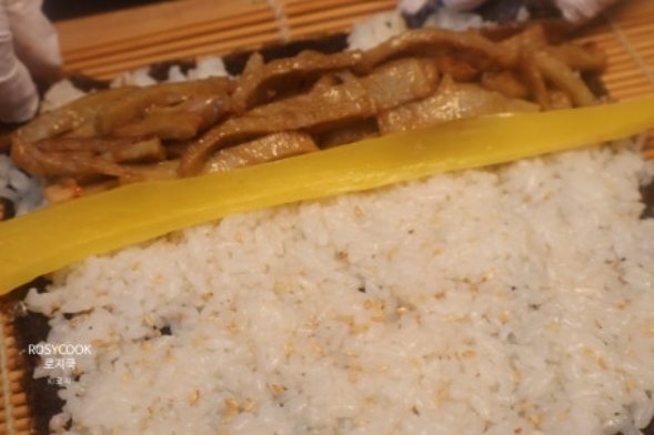 15. 동일하게 단무지와 우엉을 올려준 후, 볶아둔 매콤 어묵볶음을 올려줍니다.