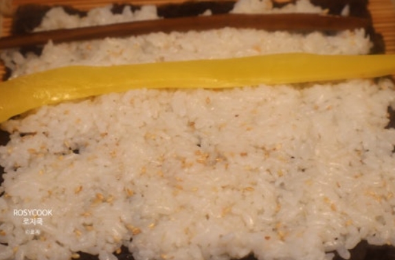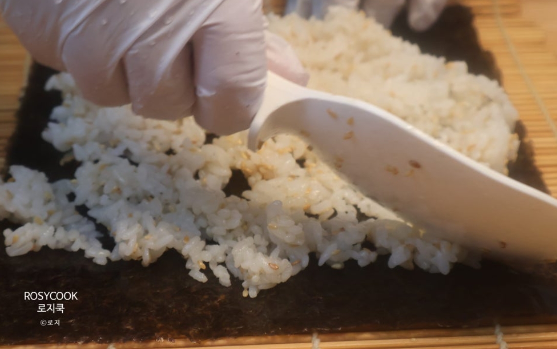 12. 김밥 김에 양념해 둔 밥을 펼쳐서 올려줍니다.