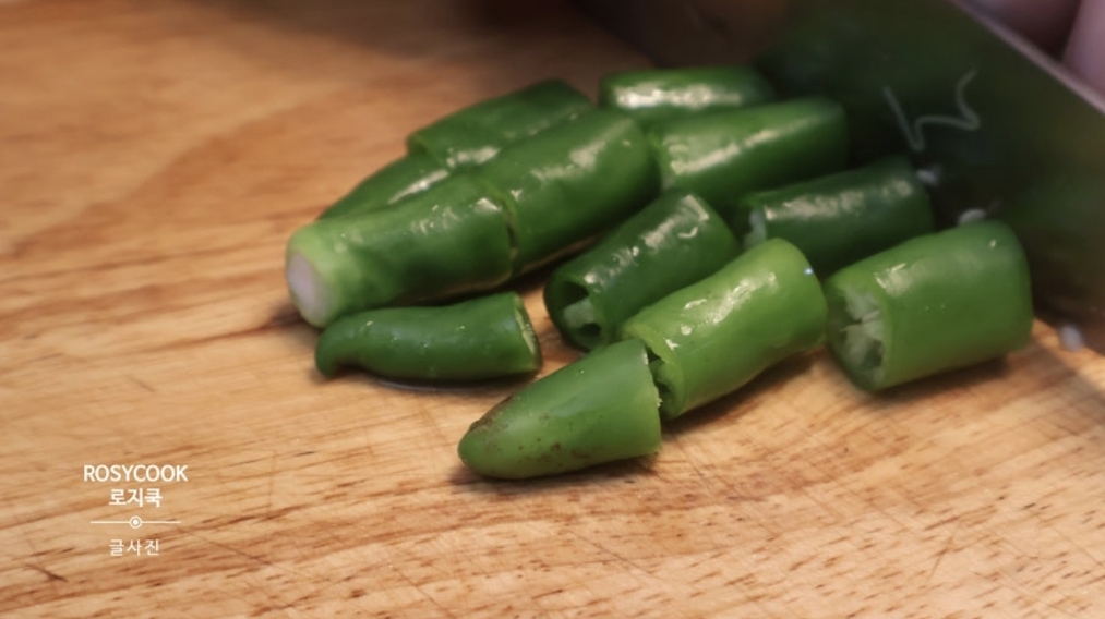 11. 마늘 10쪽을 얇게 썰어주시고 청양고추 4개도 1cm 정도 크기로 썰어줍니다.
