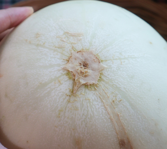 멜론 꼭지가 살짝 마른 것과 꼭지 반대 부분의 배꼽 부분을 눌렀을 때 말랑한 것이 잘 후숙된 멜론입니다. 바로 멜론을 먹고자 한다면 이러한 것을 골라오면 되지만 보통 멜론을 구입했을 땐 딱딱한 경우가 많죠.