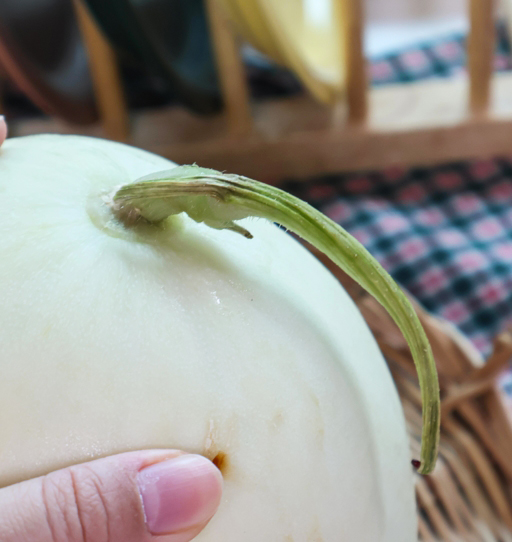 멜론 꼭지가 살짝 마른 것과 꼭지 반대 부분의 배꼽 부분을 눌렀을 때 말랑한 것이 잘 후숙된 멜론입니다. 바로 멜론을 먹고자 한다면 이러한 것을 골라오면 되지만 보통 멜론을 구입했을 땐 딱딱한 경우가 많죠.