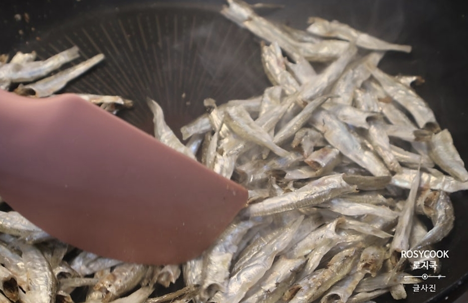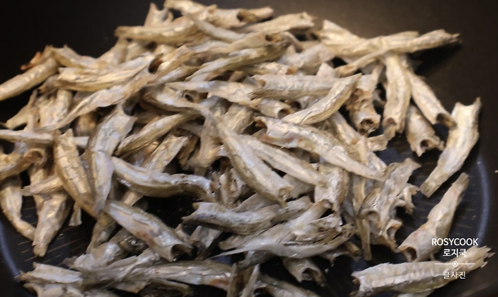 6. 손질한 멸치를 마른 팬에 바싹 볶아줍니다.