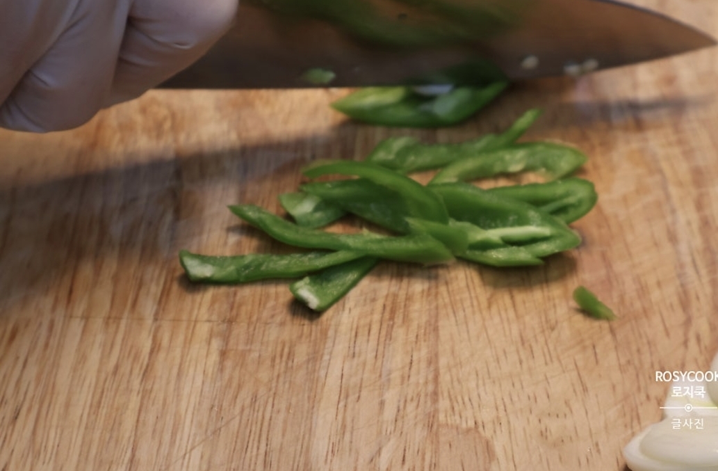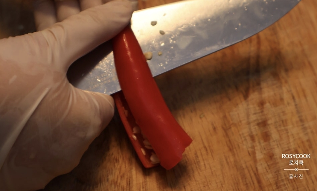 3. 청양고추 4개를 갈라준 후, 씨를 제거해 주시고 채 썰어줍니다.