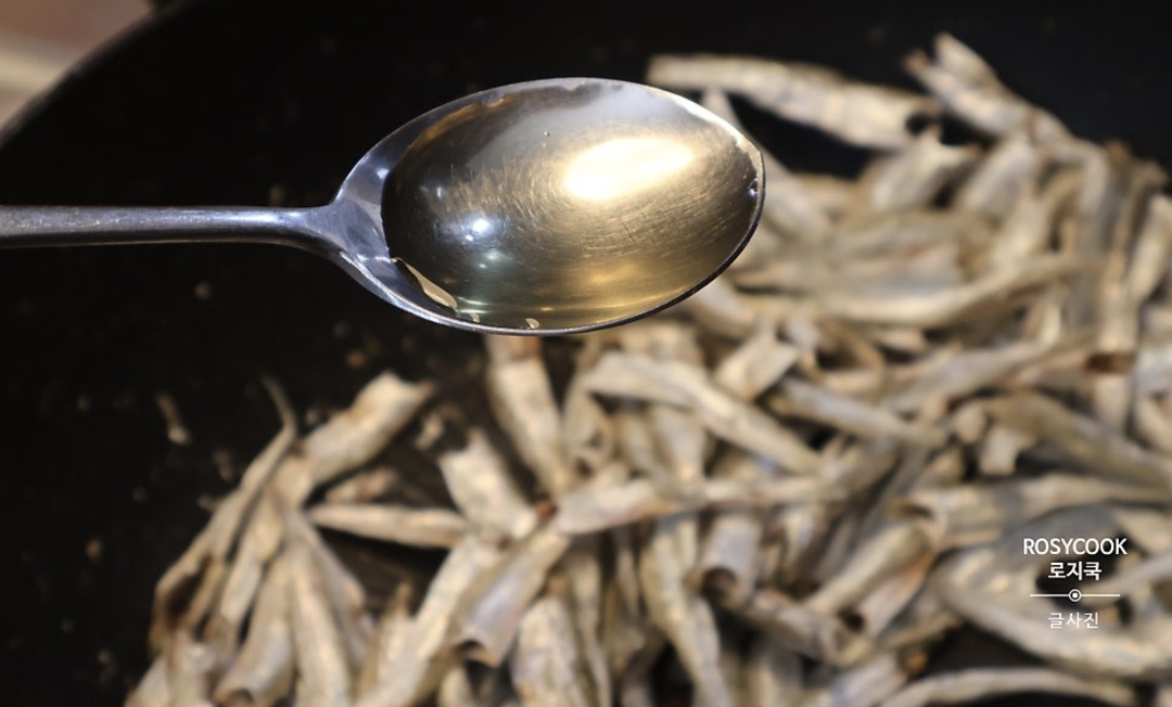 7. 멸치가 바삭하게 볶아졌다면 맛술 1 큰 술을 넣고 한 번 더 볶아줍니다.