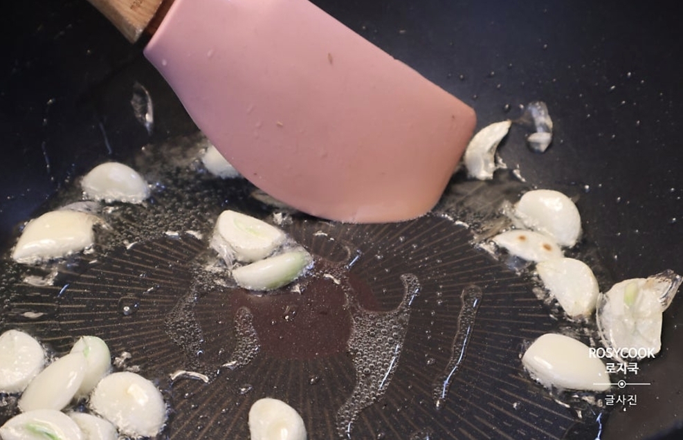 8. 팬에 식용유를 둘러주시고, 마늘을 노릇하게 볶아줍니다.