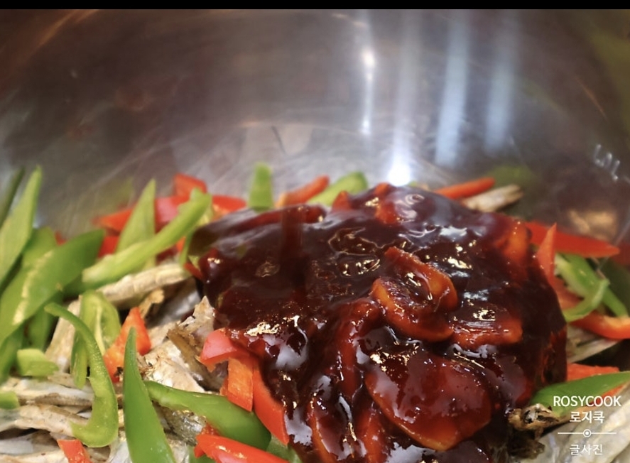 12. 볶아둔 멸치와 청양고추, 홍고추를 넣어주시고 끓여둔 고추장 양념을 넣어줍니다.